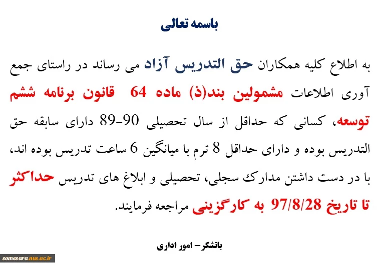 امتیاز دهید : جمع آوری اطلاعات مشمولین بند(ذ) ماده 64 قانون برنامه ششم توسعه 2 یکشنبه 27 آبان 1397 ساعت 9:29