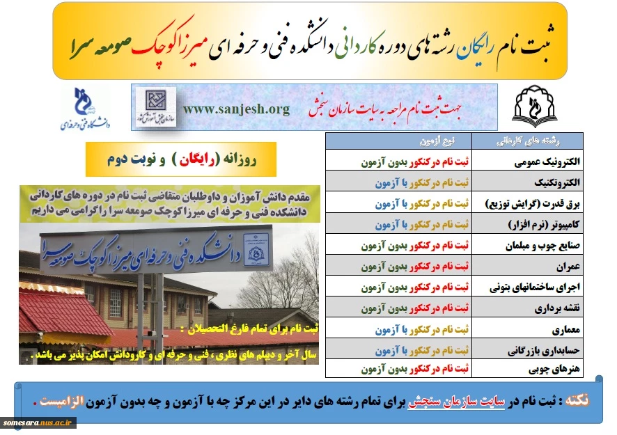 امتیاز دهید : ثبت نام رشته های دوره کاردانی دانشکده فنی و حرفه ای میرزاکوچک صومعه سرا 2 چهارشنبه 22 خرداد 1398 ساعت 15:51
