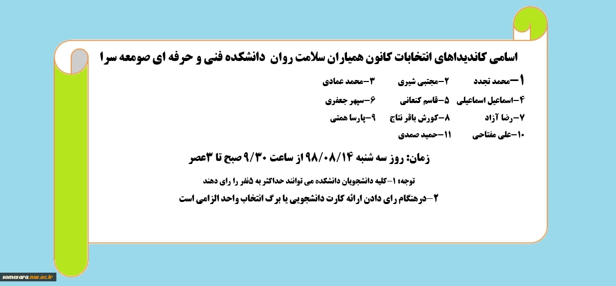 امتیاز دهید : اسامی کاندیداهای انتخابات کانون همیاران سلامت روان دانشکده فنی و حرفه ای صومعه سرا 5 یکشنبه 12 آبان 1398 ساعت 13:58