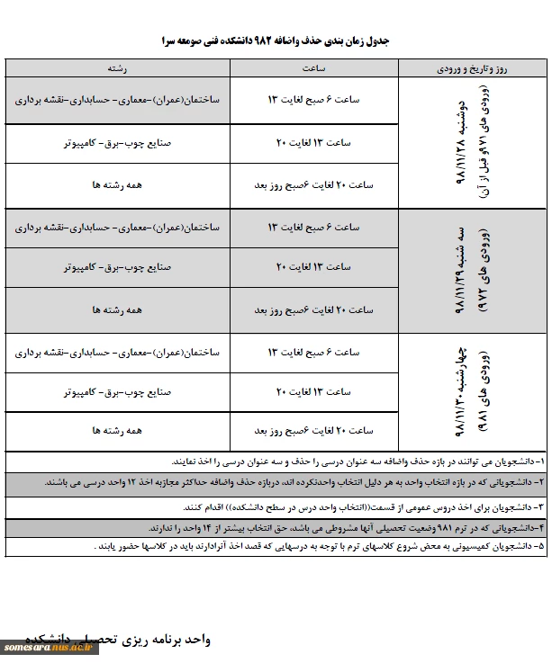 جدول زمان بندی حذف و اضافه 982 دانشکده فنی صومعه سرا 2