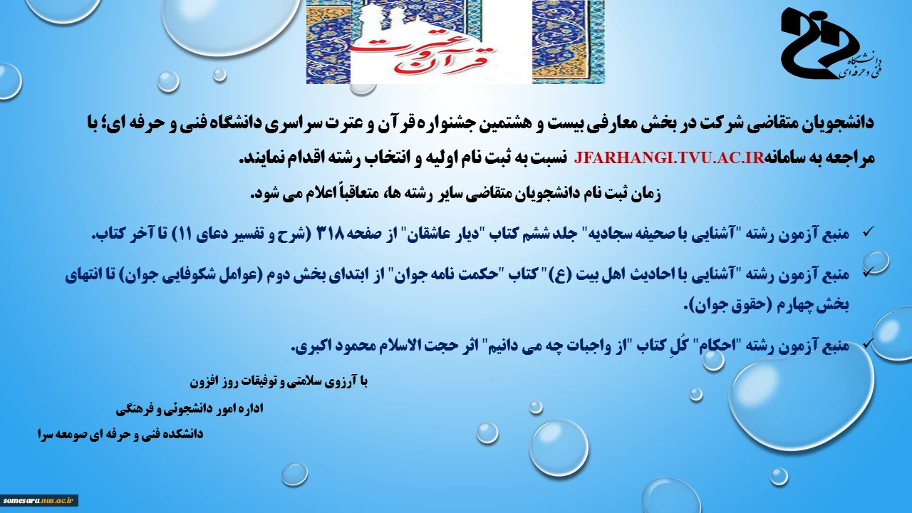 امتیاز دهید : آغاز ثبت نام سراسری در بخش معارفی بیست و هشتمین جشنواره قرآن و عترت سراسری دانشگاه فنی و حرفه ای 2 دوشنبه 5 اسفند 1398 ساعت 18:50