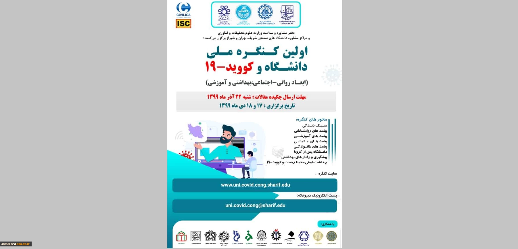 امتیاز دهید : اولین کنگره ملی دانشگاه و کوید-19 را در روزهای 17 و 18 دی ماه سال 99 2 چهارشنبه 21 آبان 1399 ساعت 9:58
