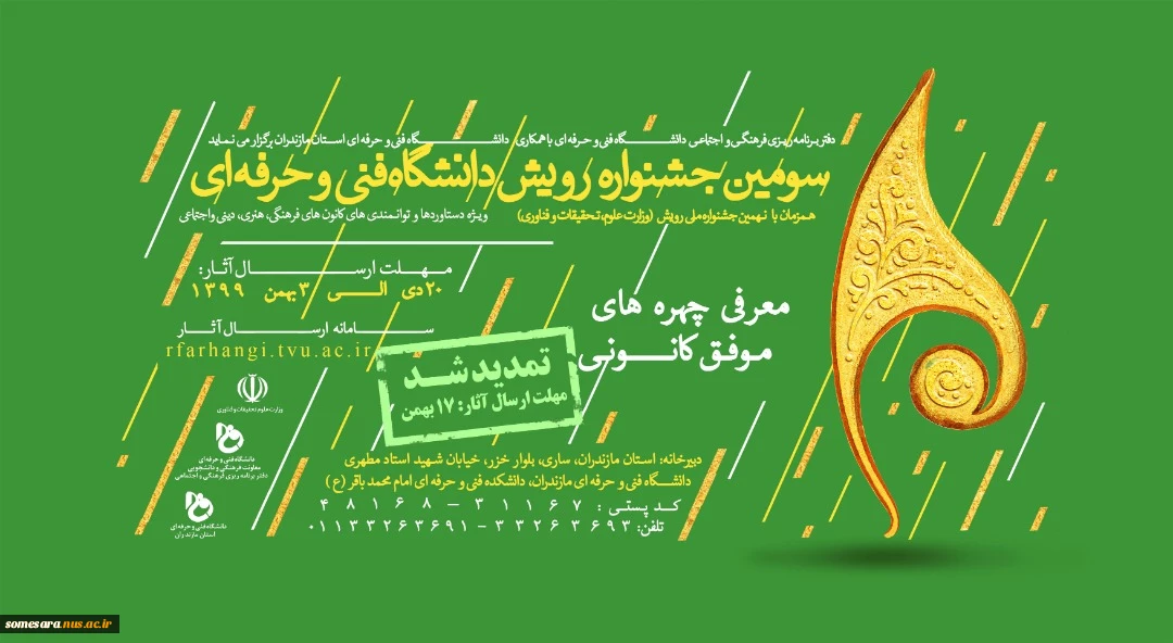 امتیاز دهید : مهلت ارسال آثار سومین جشنواره رویش دانشگاه فنی و حرفه ای تمدید شد 6 دوشنبه 6 بهمن 1399 ساعت 10:52