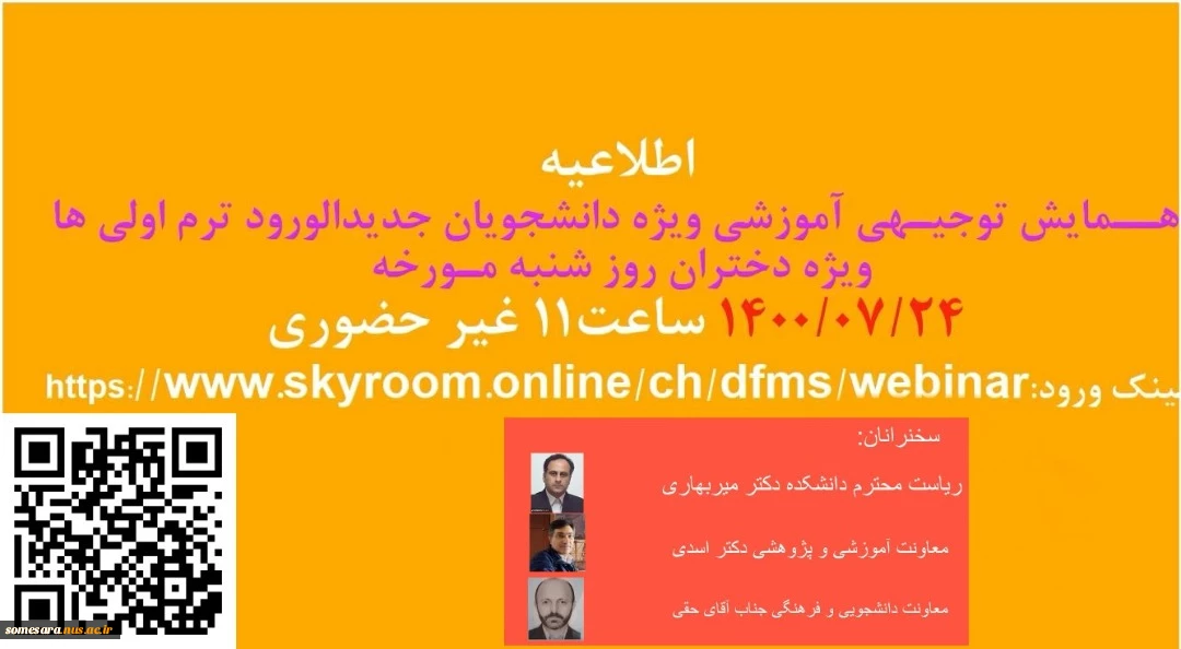 امتیاز دهید : همایش توجیهی دانشجویان جدید الورود ویژه دختران روز شنبه ساعت 11 لینک ورود https://www.skyroom.online/ch/dfms/webinar 2 چهارشنبه 21 مهر 1400 ساعت 14:37