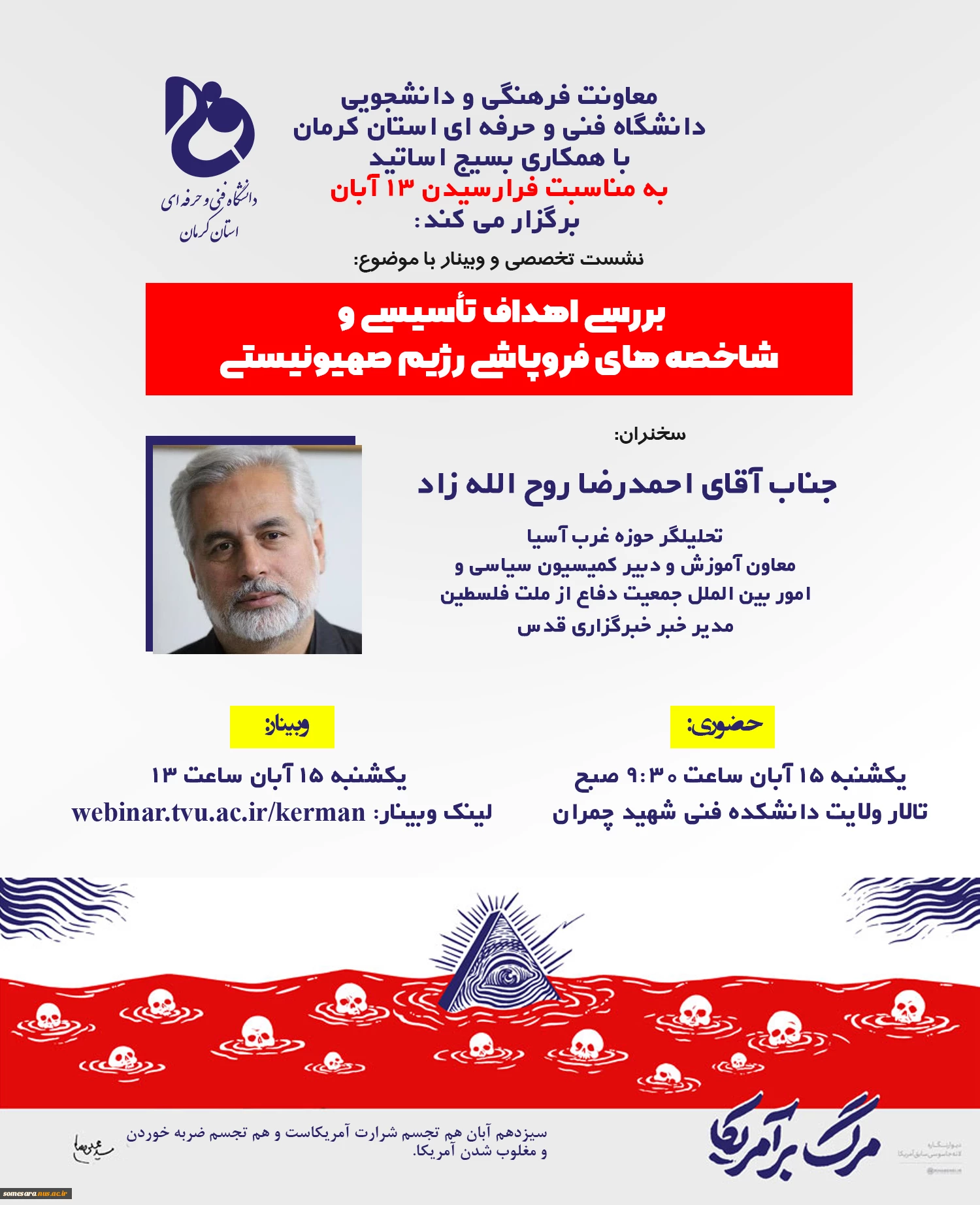 امتیاز دهید : وبینار با موضوع بررسی اهداف تأسیسی و شاخصه های فروپاشی رژیم صهیونیستی 2 یکشنبه 15 آبان 1401 ساعت 11:18