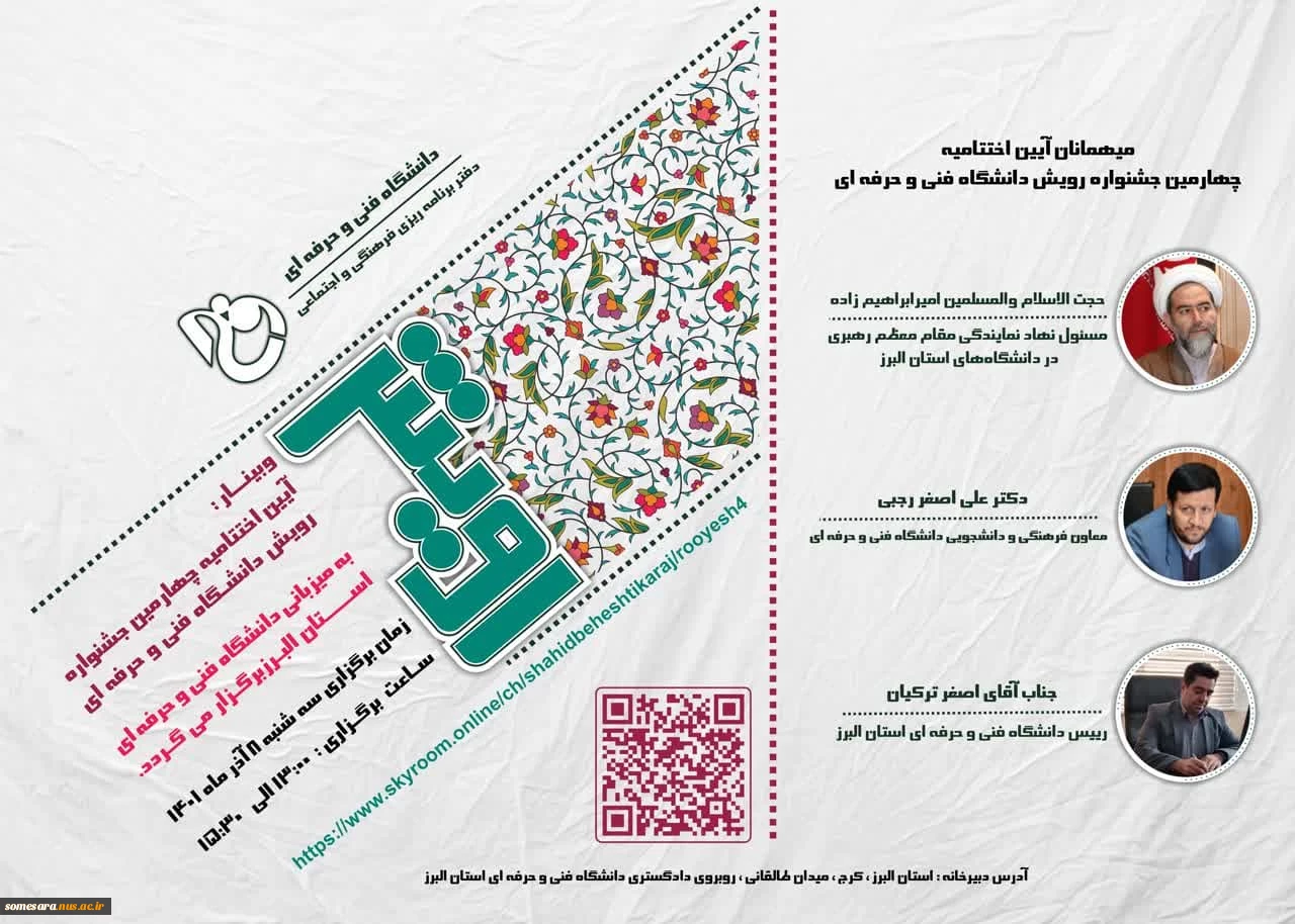 امتیاز دهید : دعوتنامه وبینار آیین اختتامیه چهارمین جشنواره رویش دانشگاه فنی و حرفه ای 2 دوشنبه 7 آذر 1401 ساعت 11:30