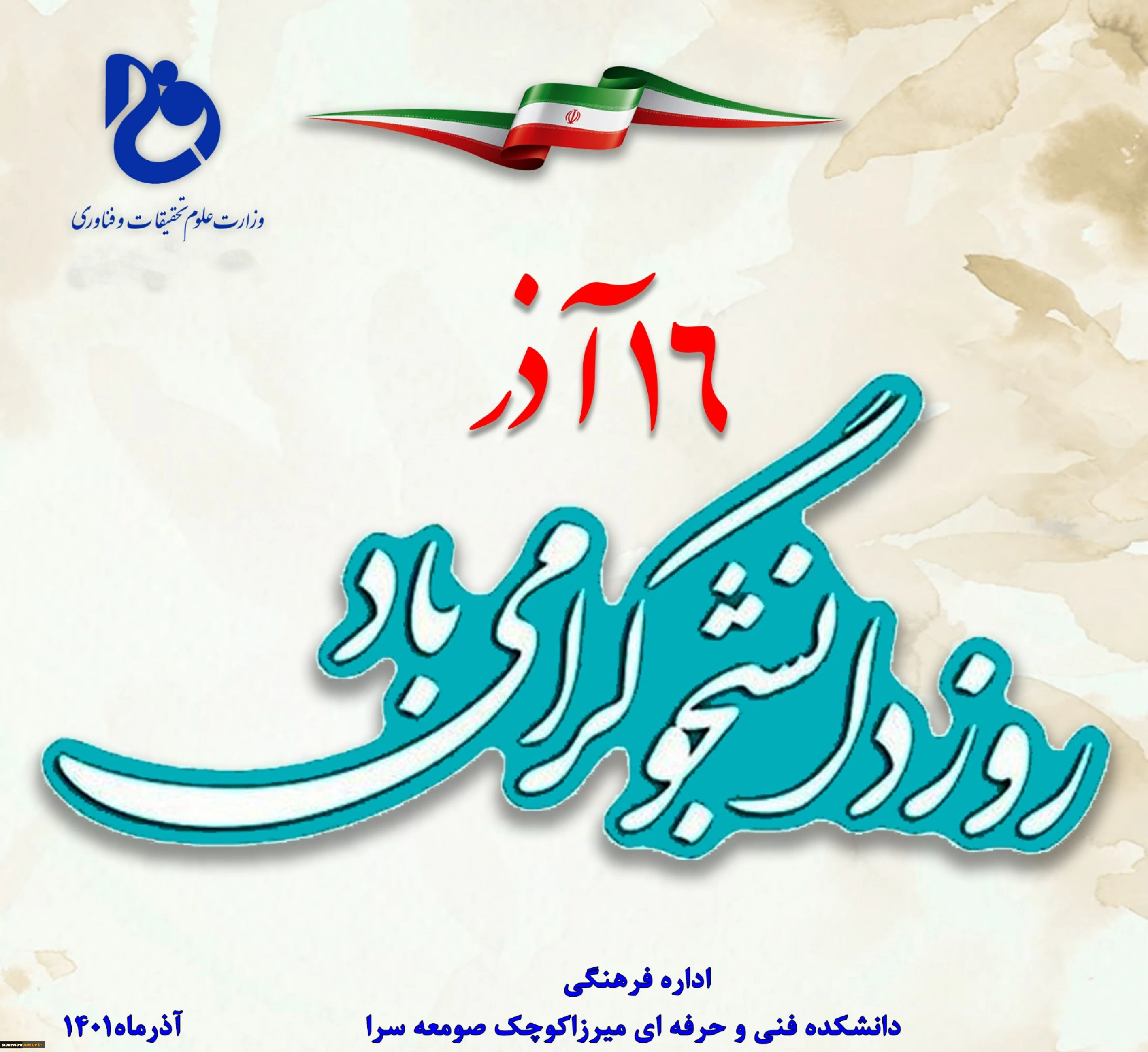 امتیاز دهید : تبریک ریاست محترم دانشکده جناب آقای میر بهاری در پیامی سالگرد حماسه ۱۶ آذر را به جامعه علمی و دانشگاهی کشور بهویژه دانشجویان فرهیخته دانشکده فنی و حرفهای میرزاکوچک صومعه سراتبریک گفتند که در سایت و فضای مجازی دانشکده بارگزاریگردیده است. 2 شنبه 19 آذر 1401 ساعت 9:36