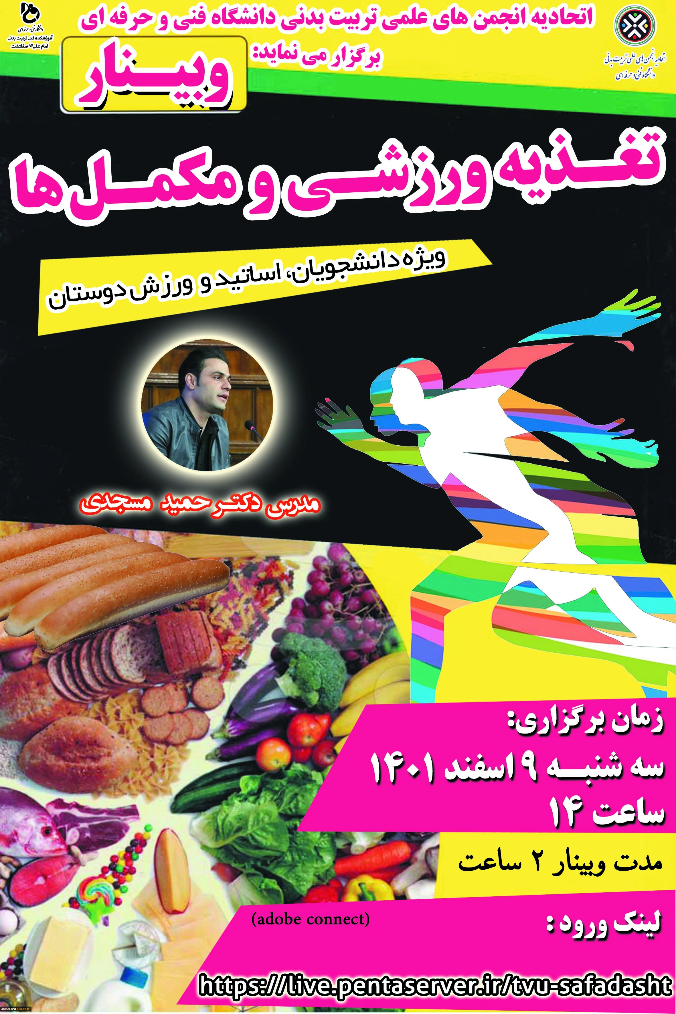 امتیاز دهید : وبینار تغذیه ورزشی و مکمل ها - اتحادیه انجمن های علمی تربیت بدنی دانشگاه فنی و حرفه ای 2 یکشنبه 30 بهمن 1401 ساعت 8:17