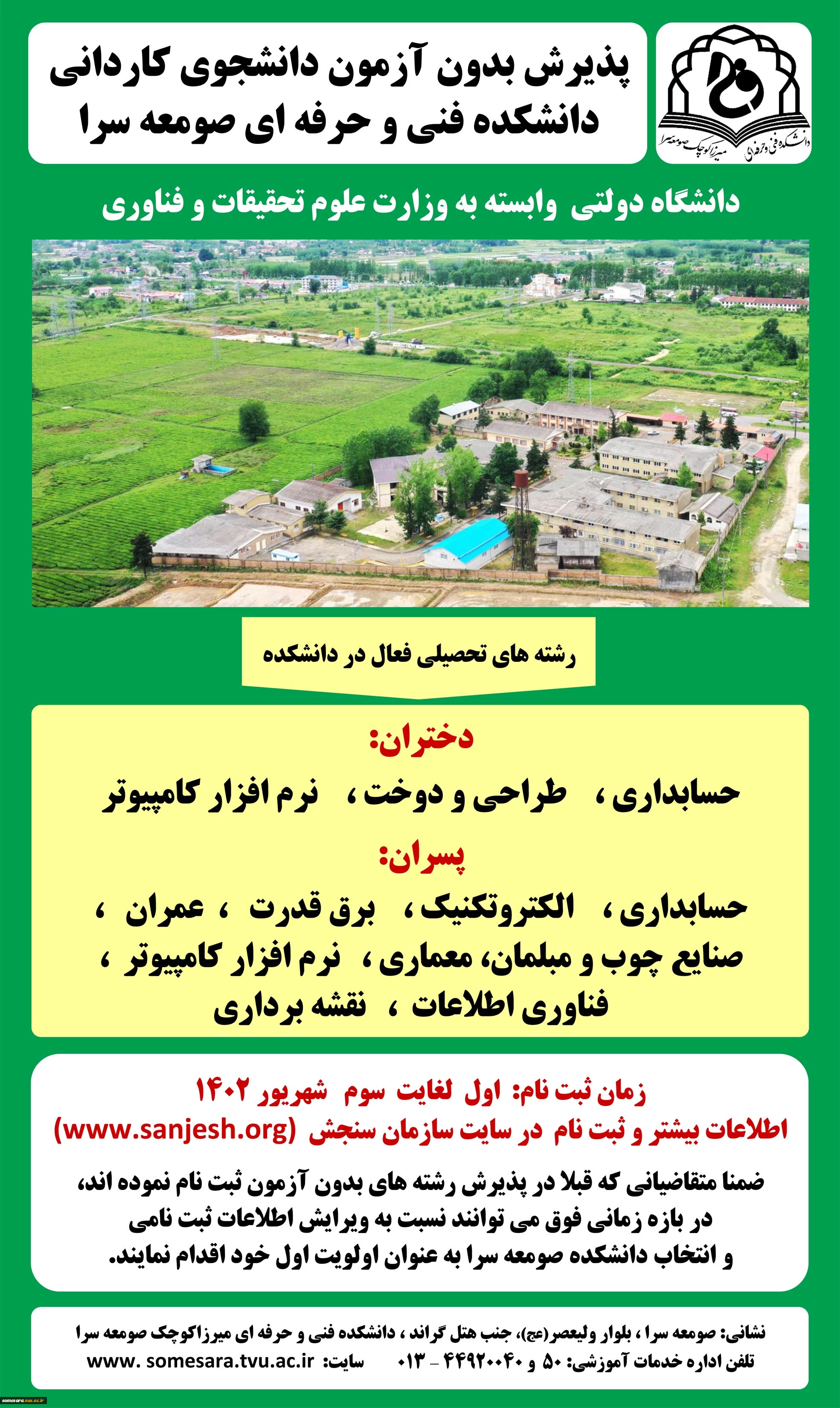 امتیاز دهید : پذیرش دانشجوی کاردانی (اسامی و ظرفیت رشته های دانشکده صومعه سرا) 2 پنجشنبه 15 تیر 1402 ساعت 16:26