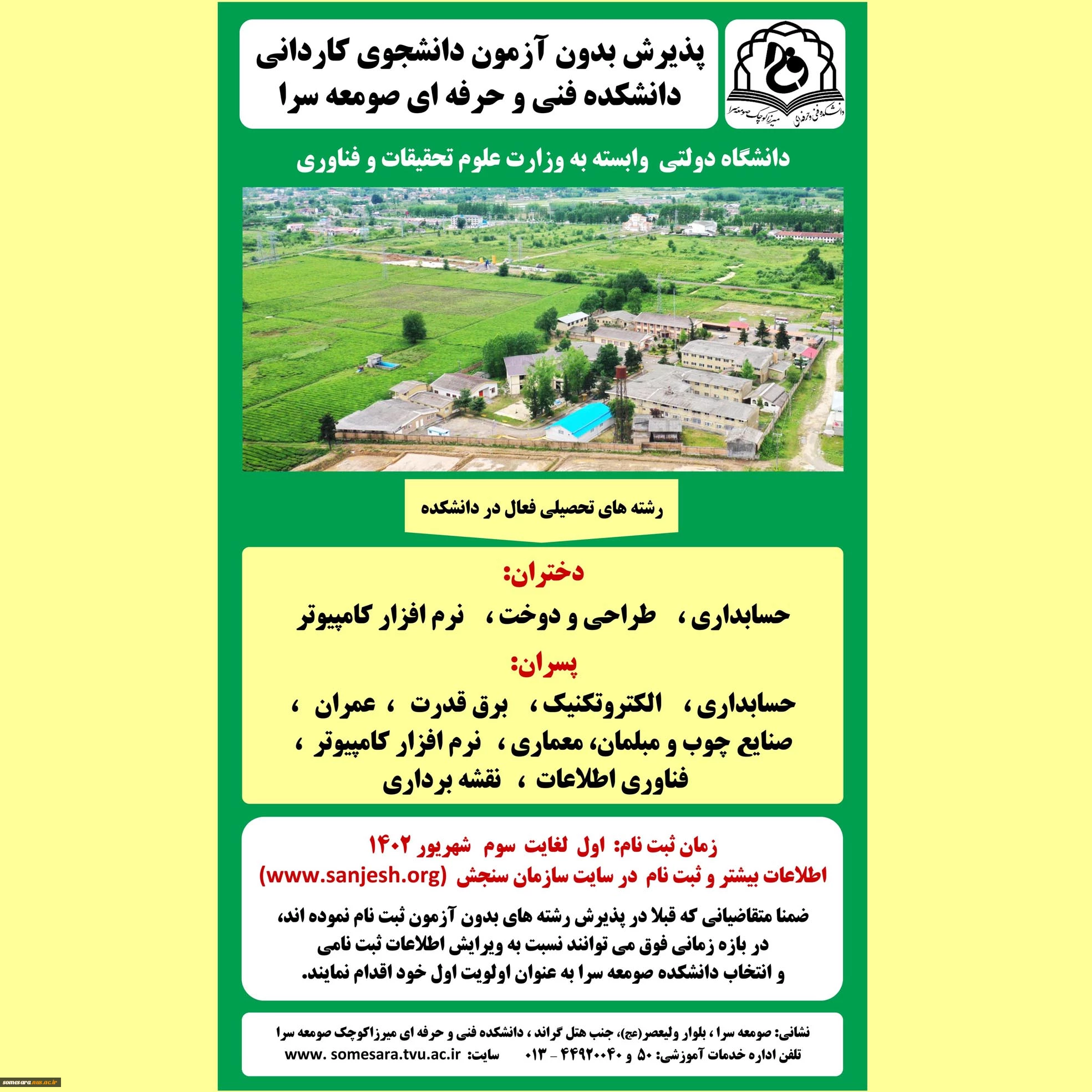 امتیاز دهید : پذیرش دانشجوی کاردانی (اسامی و ظرفیت رشته های دانشکده صومعه سرا) 2 پنجشنبه 15 تیر 1402 ساعت 16:26