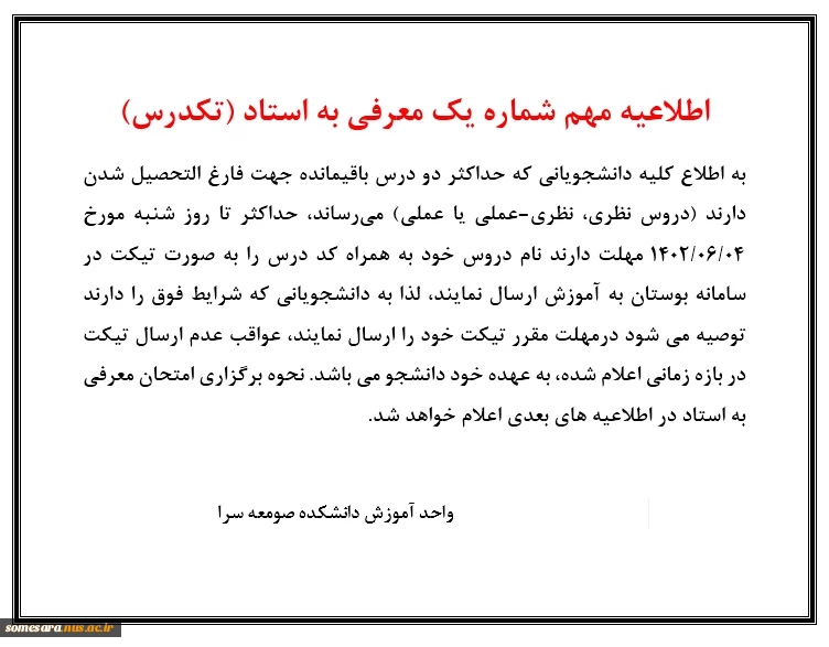 اطلاعیه شماره یک معرفی به استاد(تکدرس) 2