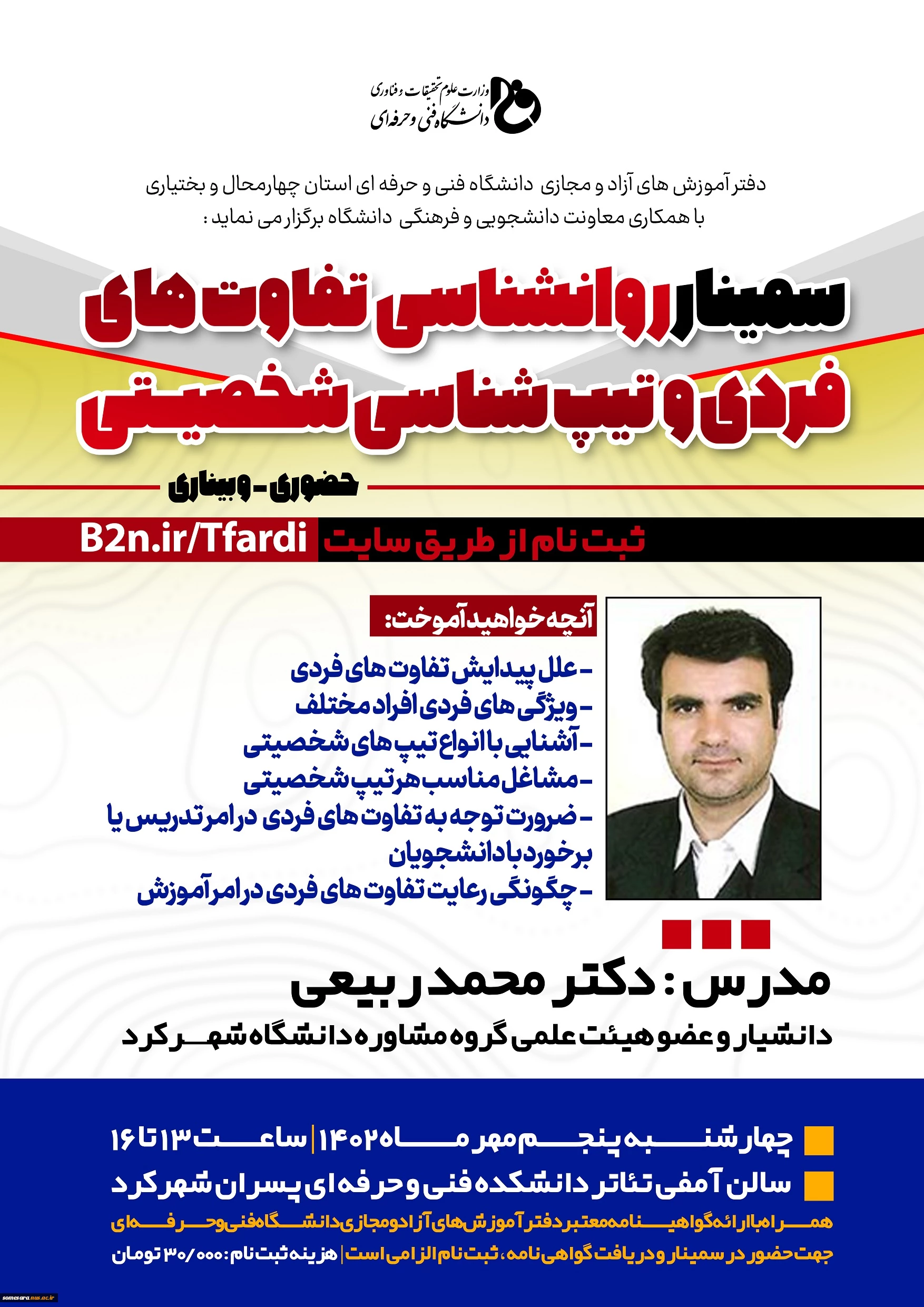 امتیاز دهید : اطلاع رسانی وبینار آموزشی " روانشناسی تفاوت های فردی و تیپ هی شخصیتی " 2 سهشنبه 4 مهر 1402 ساعت 9:10