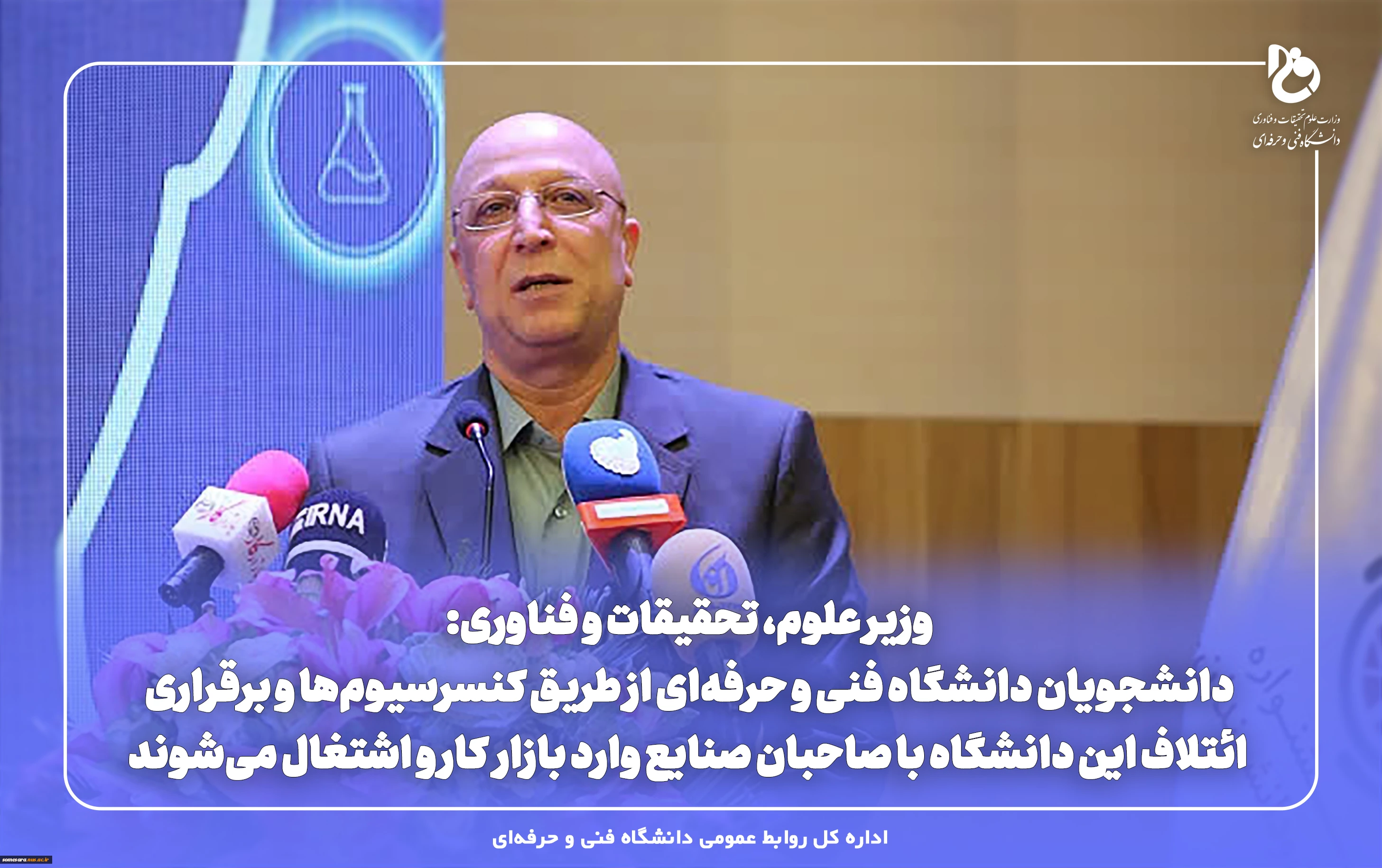امتیاز دهید : وزیر علوم، تحقیقات و فناوری: دانشجویان دانشگاه فنی و حرفهای از طریق کنسرسیومها و برقراری ائتلاف این دانشگاه با صاحبان صنایع وارد بازار کار و اشتغال میشوند. 2 یکشنبه 10 دی 1402 ساعت 14:59