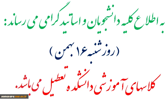 فردا(شنبه16بهمن) کلاسهای آموزشی دانشکده تعطیل می باشد 2
