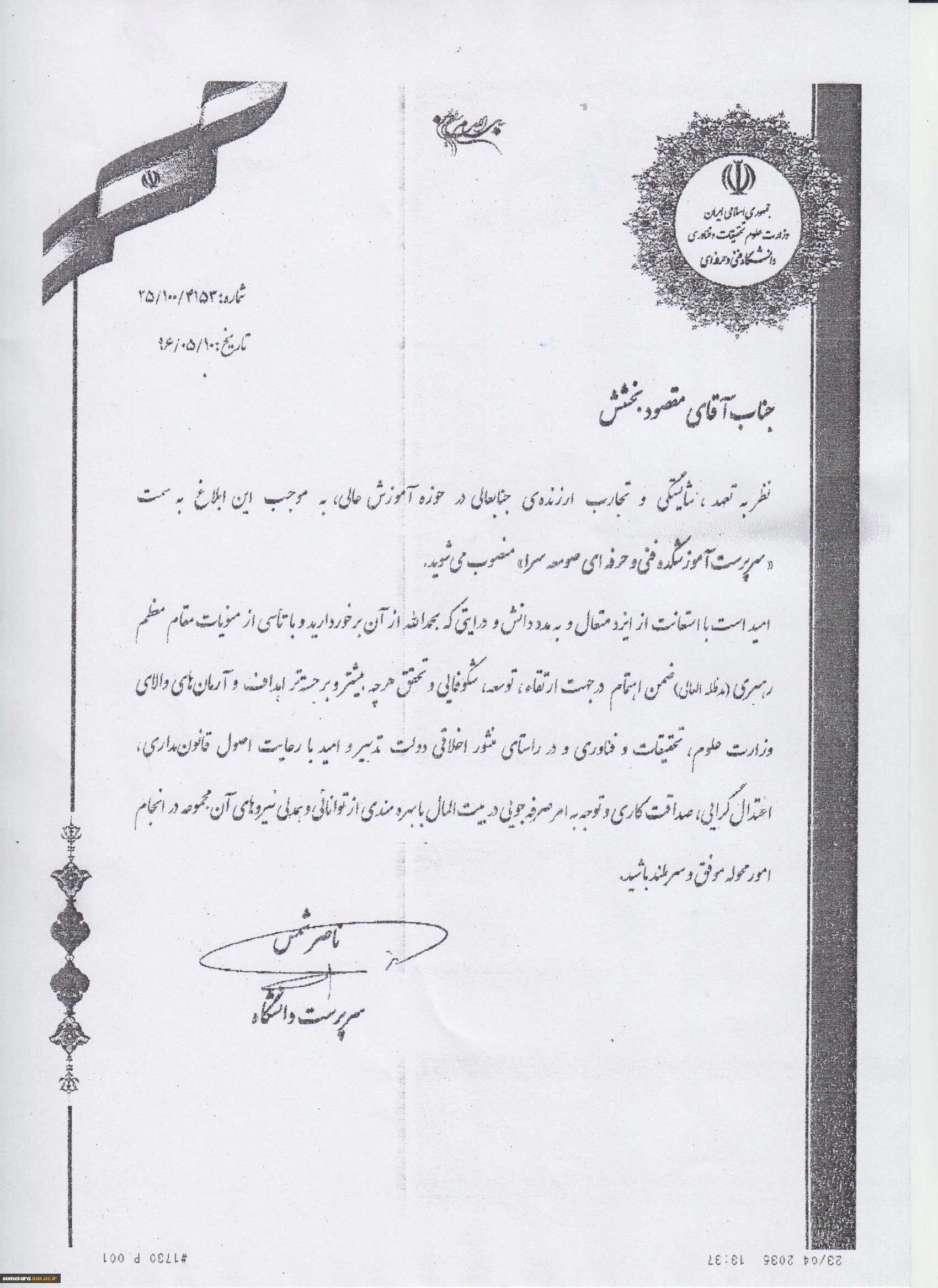 حکم سرپرستی جناب آقای دکتر مقصود بخشش 2
